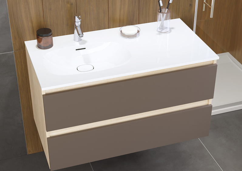 Disponibles en L 80 cm simple vasque, en L 100 et 120 cm simple vasque à gauche ou à droite et en L 120 et 140 cm double vasque.